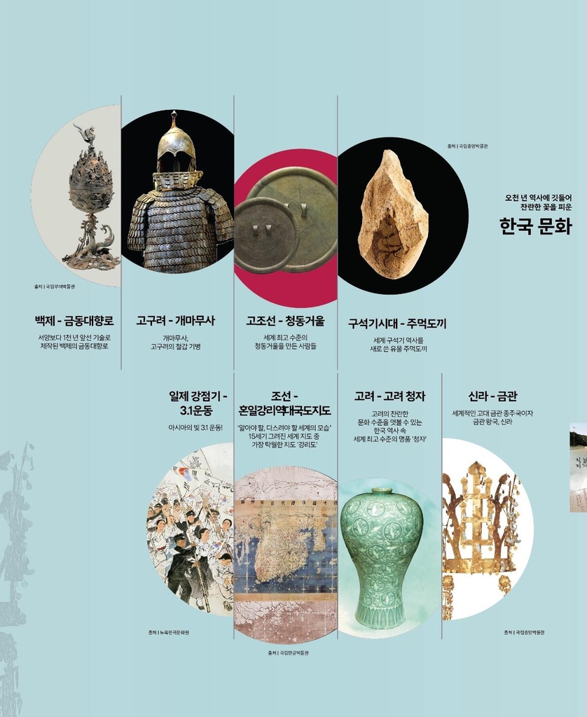 또 구석기 시대 주먹도끼, 고조선 청동거울, 고구려 철갑기병 개마무사, 백제 금동대향로, 신라금관, 고려청자, 조선 혼일강리역대국도지도, 일제강점기 3·1운동 등 오천 년 역사 속에 깃든 한국 문화를 선보인다.