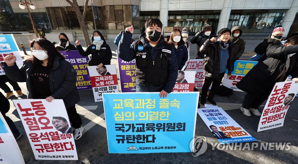| ▲ 2022 개정 교육과정 개악 규탄 기자회견 (서울=연합뉴스) 김인철 기자 = 18일 오후 서울 종로구 정부서울청사 후문 앞에서 열린 2022 개정 교육과정 개악 규탄 기자회견에서 학교부터노동교육운동본부 관계자들이 구호를 외치고 있다. 2022.12.18 yatoya@yna.co.kr |