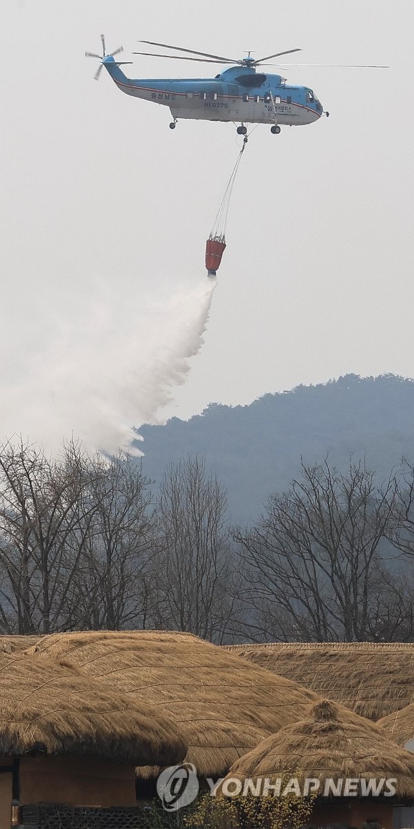 | ▲ 하회마을에 투입된 헬기 (안동=연합뉴스) 황수빈 기자 = 경북북부 산불이 엿새째 꺼지지 않고 있는 27일 안동 하회마을에 헬기가 물을 뿌리고 있다. 2025.3.27 hsb@yna.co.kr |