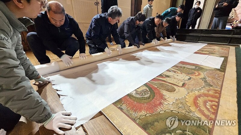 | ▲ 이동 준비 중인 봉정사 아미타설법도 (안동=연합뉴스) 천경환 기자 = 경북 의성에서 시작한 산불이 나흘째 북부권역으로 확산한 26일. 국가 보물들이 보관된 안동 봉정사에서 긴급 유물 이송 작업이 이뤄지고 있다. 2025,3.26 kw@yna.co.kr |