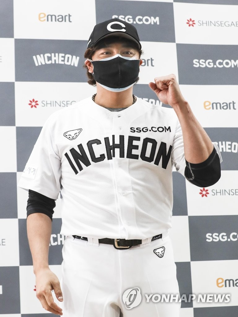 | ▲ Choo Shin-soo of the SSG Landers poses for photos at Sajik Stadium in Busan, 450 kilometers southeast of Seoul, on March 11, 2021. (Yonhap) |
