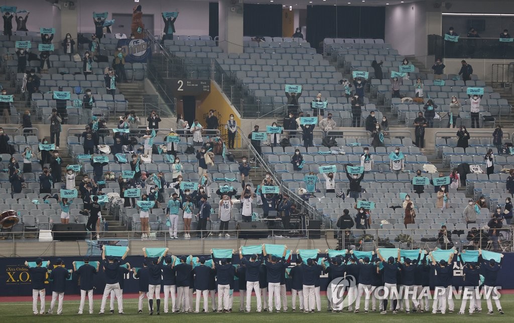 | ▲ In this file photo from Nov. 24, 2020, members of the NC Dinos acknowledge their fans at Gocheok Sky Dome in Seoul after winning the Korean Series. (Yonhap) |