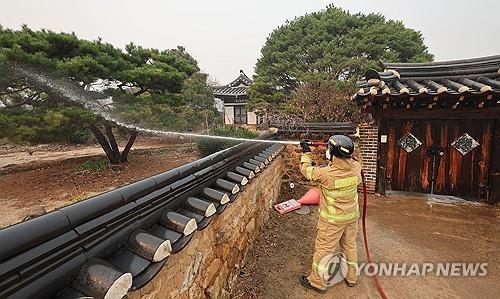 | ▲ '산불 접근 방지' 하회마을에 물 뿌리는 소방대원 (안동=연합뉴스) 천경환 기자 = 26일 경북 안동 하회마을에서 소방대원이 산불 불씨가 옮겨 붙지 않도록 마을 곳곳에 물을 뿌리고 있다. 2025.3.26 kw@yna.co.kr |