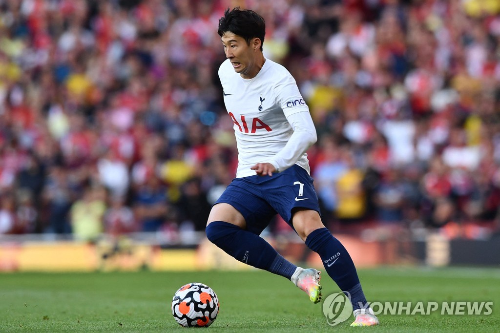 | ▲ In this AFP photo, Son Heung-min of Tottenham Hotspur runs with the ball during a Premier League match against Arsenal at Emirates Stadium in London on Sept. 26, 2021. (Yonhap) |