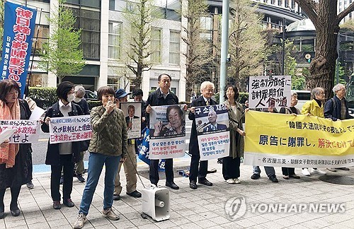| ▲ Japanese civic groups and family members of Lee Chun-sik, a late Korean victim of Japan's wartime forced labor, hold a rally in Tokyo calling for Japan's Mitsubishi Heavy Industries and Nippon Steel to apologize to the victims and compensate them for the forced mobilization, in this photo taken April 12, 2025, as provided by the Seoul-based Center for Historical Truth and Justice. (PHOTO NOT FOR SALE) (Yonhap) |