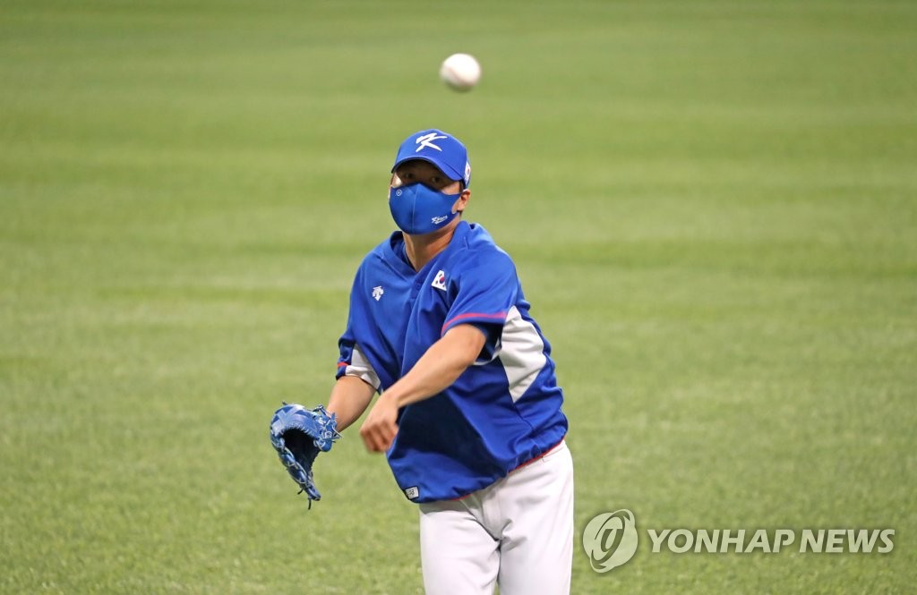 ▲ South Korean pitcher Cha Woo-chan plays catch during practice for the Tokyo Olympics at Gocheok Sky Dome in Seoul on July 21, 2021. (Yonhap)