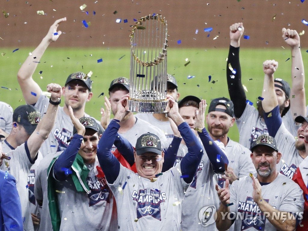 ▲ 2021년 월드시리즈 우승 트로피를 들어올린 애틀랜타 브레이브스 [UPI=연합뉴스 자료사진]