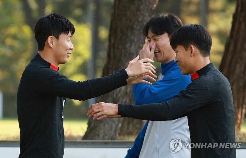 | ▲ 포옹하는 손흥민-정우영 (파주=연합뉴스) 한종찬 기자 = 9일 오후 파주NFC(축구대표팀 트레이닝센터)에서 열린 한국 축구대표팀 소집훈련에서 손흥민이 정우영과 포옹하고 있다. 국제축구연맹(FIFA) 랭킹 26위인 축구대표팀은 13일 오후 8시 서울월드컵경기장에서 튀니지(29위), 17일 오후 8시 수원월드컵경기장에서 베트남(95위)과 잇달아 맞붙는다. 2023.10.9 saba@yna.co.kr |