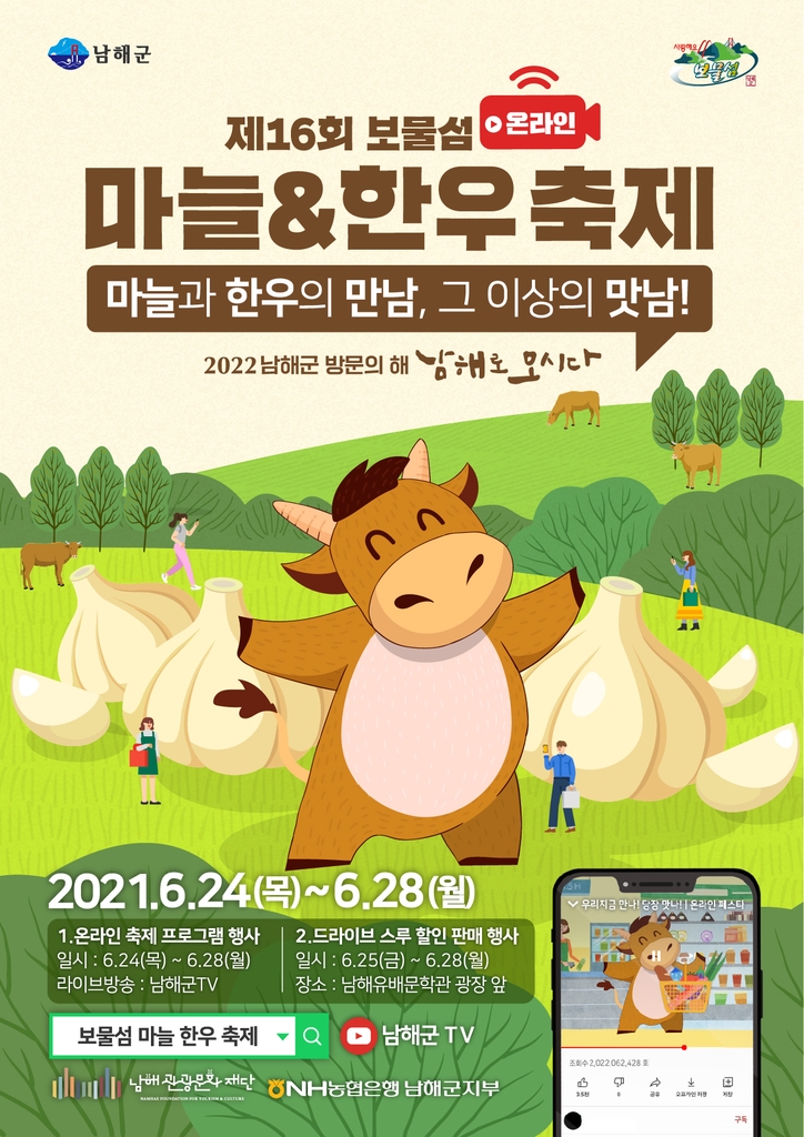 개최일인 24일 남해유배문학관 메인무대의 랜선 개막식에 이어 온라인 참가자와 함께 마늘과 한우를 주제로 퀴즈를 풀어보는 도전 맛남벨, 실시간 라이브 커머스 프로그램인 맛남 홈쇼핑, 마늘한우 밀키트를 론칭하는 맛남 푸드쇼가 펼쳐진다.