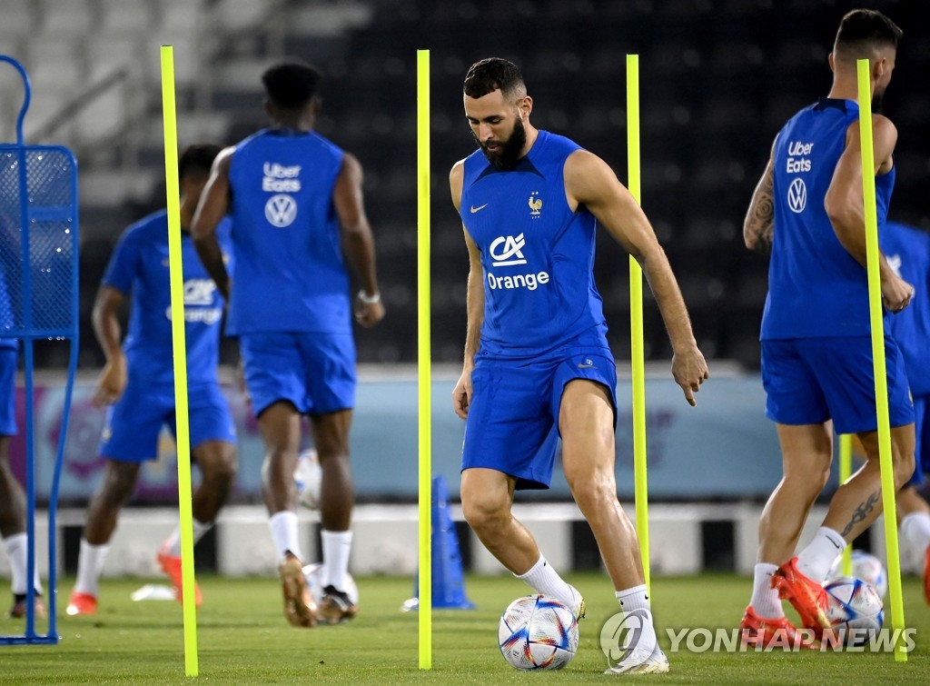 | ▲ 프랑스 대표팀 부상으로 낙마한 '발롱도르' 벤제마 (도하 AFP=연합뉴스) 프랑스 축구 국가대표팀의 카림 벤제마(가운데·레알 마드리드)가 지난달 19일(현지시간) 카타르 도하의 자심 빈 하마드 스타디움에서 동료들과 함께 공을 다루며 훈련하고 있다. 지난시즌 발롱도르를 수상하며 유럽 최정상 공격수로 인정받은 벤제마는 이번 대회에서 우승을 노렸으나, 이날 끝내 종아리 부상으로 대회 개막을 하루 앞두고 대표팀에서 낙마했다. 2022.11.20 alo95@yna.co.kr |