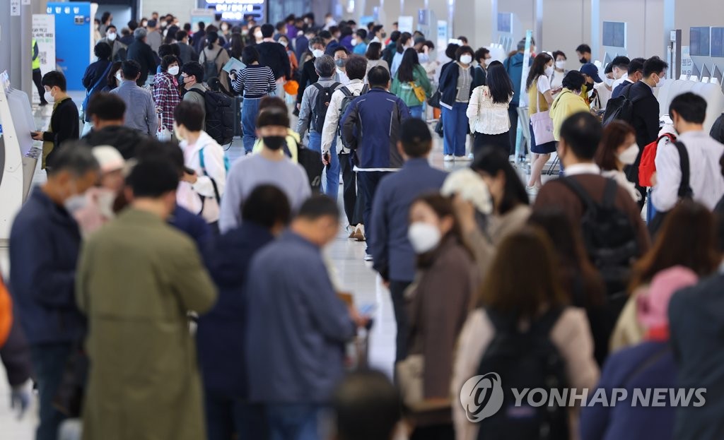 | ▲ Gimpo International Airport in Seoul is crowded with people wearing masks on April 29, 2022. (Yonhap) |