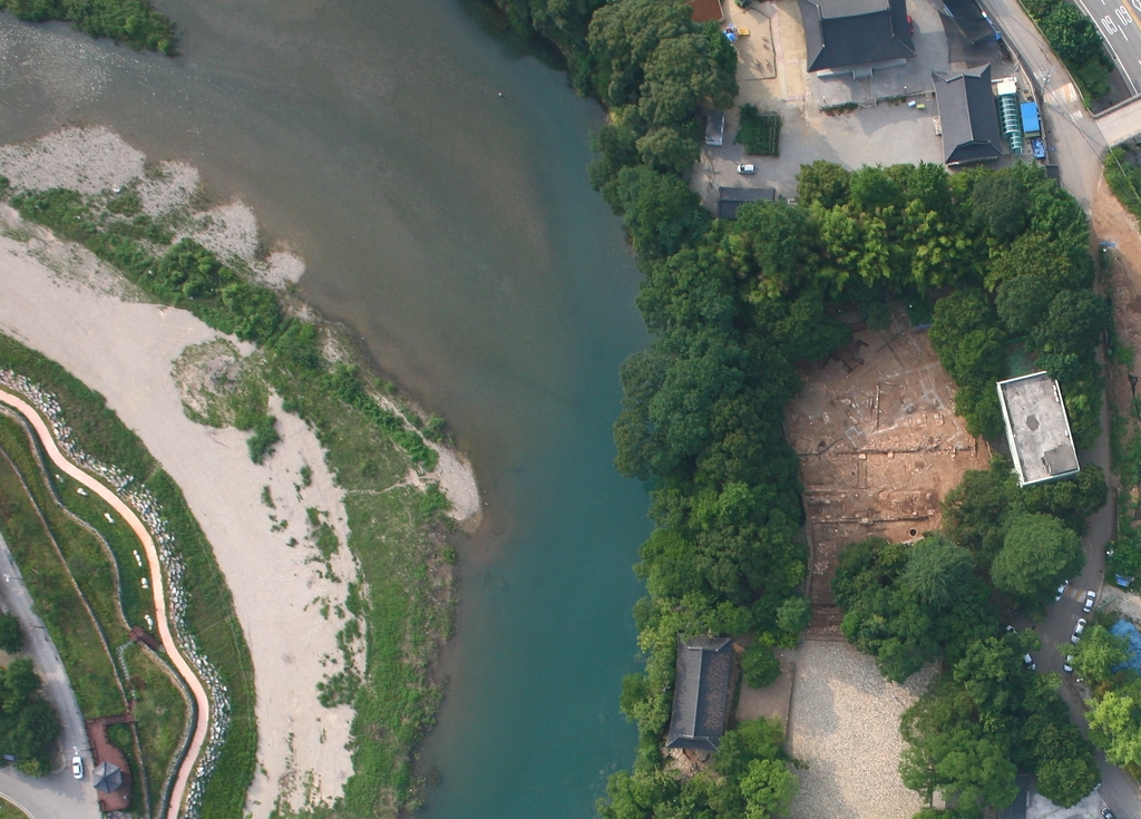 | ▲ 삼척도호부 관아지 오른쪽 나무에 둘러싸진 조사 지역이 관아 터. [문화재청 제공. 재판매 및 DB 금지] |
