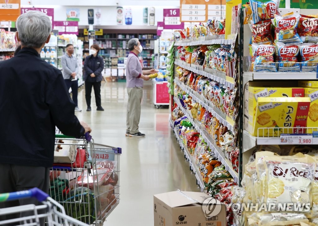 | ▲ People look at shelves of various snacks at a discount store, in this file photo taken April 21, 2022. (Yonhap) |
