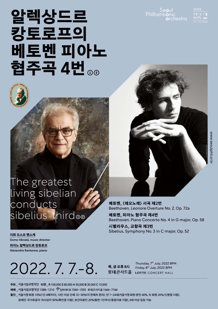 지난 4월 첫 내한 리사이틀 무대에서 호연을 선보인 캉토로프는 베토벤 협주곡 중 가장 독창적이면서 시적인 매력을 지닌 것으로 평가되는 피아노 협주곡 4번을 협연할 예정이다. 서울시향은 이 공연에서 베토벤의 '레오노레' 서곡 제2번으로 시즌 시작을 알린다.