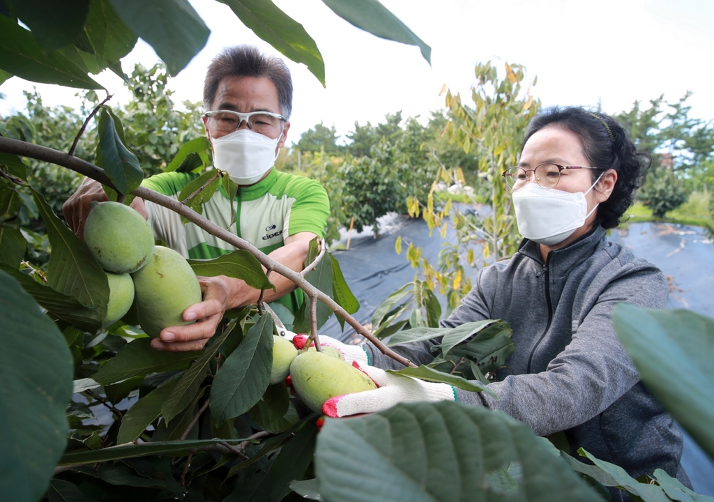 (태안=연합뉴스) 14일 충남 태안군 태안읍 도내리 한 농원에서 농민들이 포포나무 열매를 수확하고 있다.