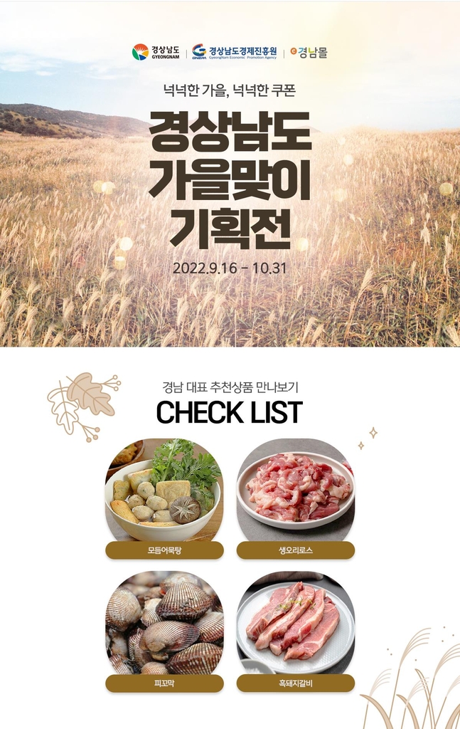 (창원=연합뉴스) 경남도는 오는 16일부터 10월 31일까지 도내 소상공인의 우수상품을 할인된 가격으로 만날 수 있는 가을맞이 기획전을 '티몬'에서 개최한다고 15일 밝혔다.