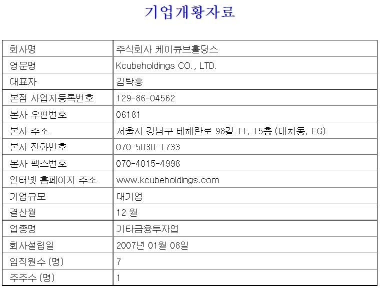 | ▲ 케이큐브홀딩스 2021년 4월 5일 기준 기업개황 자료 [금융감독원 전자공시시스템 캡처. 재판매 및 DB 금지] |