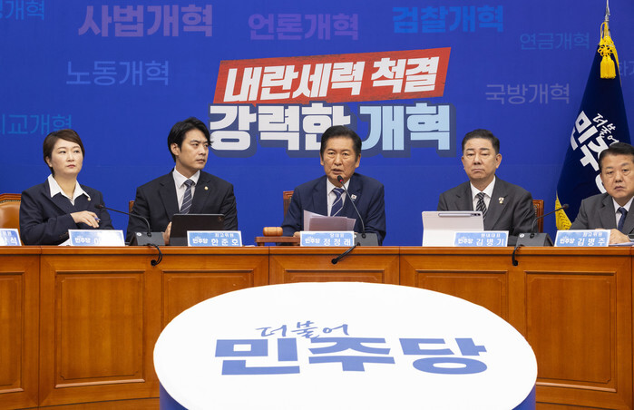 Ruling party's leader Jung Chung-rae (C), leader of the ruling Democratic Party, speaks during a meeting of the party's Supreme Council at the National Assembly in Seoul on Sept. 1, 2025. (Yonhap)(END)