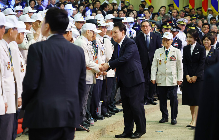 President Yoon Suk Yeol (C) greets Korean War veterans during a ceremony marking the conflict's 74th anniversary in Daegu, 237 kilometers southeast of Seoul, on June 25, 2024. (Pool photo) (Yonhap)