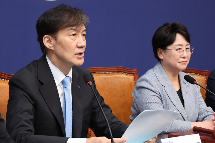 Cho Kuk (L), head of the policy think tank at the minor Rebuilding Korea Party, speaks during a meeting of the party's Supreme Council at the National Assembly in Seoul on Sept. 1, 2025. (Yonhap)