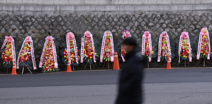 Wreaths sent by supporters of President Yoon Suk Yeol are displayed near the presidential office in Seoul on Dec. 11, 2024, opposing his impeachment over the six-hour imposition of martial law. (Yonhap)