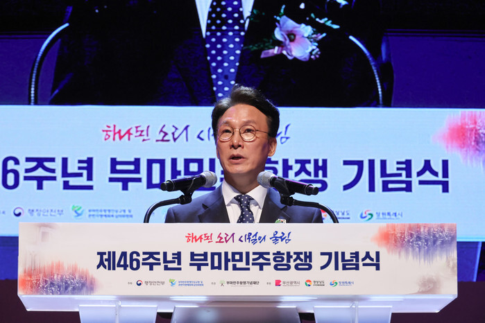 Prime Minister Kim Min-seok addresses a ceremony to mark the 46th anniversary of the Busan-Masan Democratic Protests in the southeastern coastal city of Changwon on Oct. 16, 2025. The student-led protests, which occurred in Changwon, then called Masan, and the nearby port of Busan from Oct. 16-20, 1979, led to the demise of the autocratic regime of Park Chung-hee. (Yonhap)