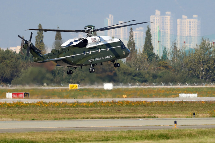 Marine One carrying U.S. President Donald Trump lands at Gimhae airport in the southeastern port city of Busan on Oct. 30, 2025, ahead of his planned talks with Chinese President Xi Jinping later in the day. (Yonhap)