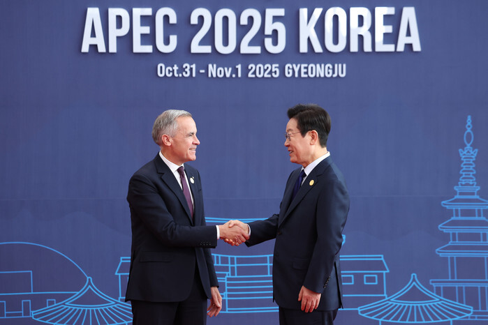 South Korean President Lee Jae Myung (R) shakes hands with Canadian Prime Minister Mark Carney at the Gyeongju Hwabaek International Convention Center in the southeastern South Korean city of Gyeongju on Oct. 31, 2025, ahead of the opening of the Asia-Pacific Economic Cooperation summit. (Yonhap)