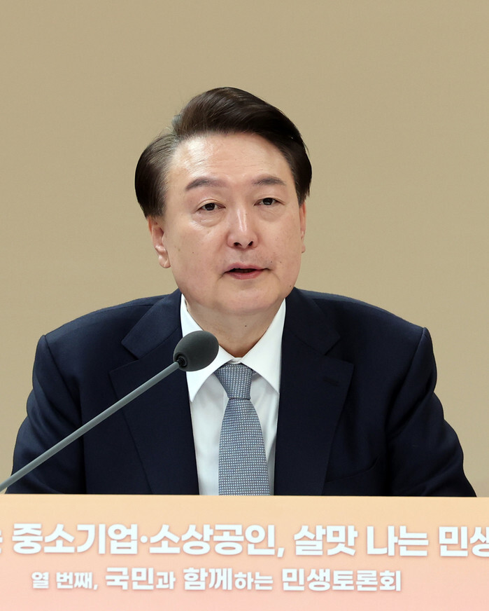 President Yoon Suk Yeol speaks during a government-public debate to discuss ways to improve the livelihoods of small and midsize firms and small business owners at Layer 57 studio in Seoul on Feb. 8, 2024. (Pool photo) (Yonhap)