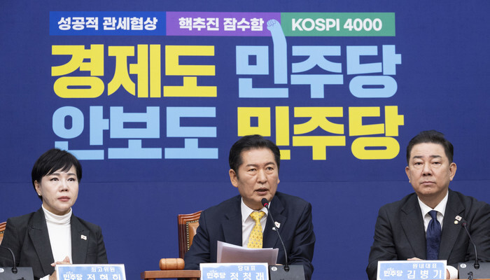 Jung Chung-rae (C), leader of the ruling Democratic Party, attends a meeting of its Supreme Council at the National Assembly in Seoul on Nov. 3, 2025. (Yonhap)
