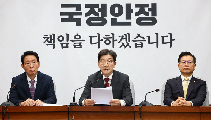 Kweon Seong-dong (C), floor leader of the ruling People Power Party, speaks during a meeting of the party at the National Assembly in Seoul on Feb. 7, 2025. (Yonhap)