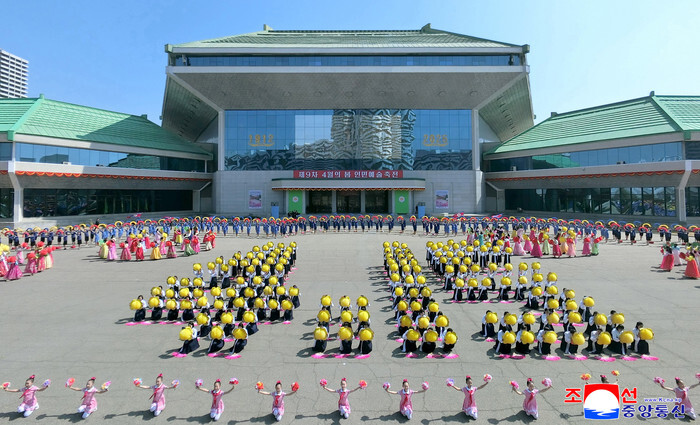North Korean people form the date "4.15" as they take part in an art festival at the Pyongyang Circus Theatre in the North Korean capital on April 10, 2025, as part of festivities to celebrate the 113th birth anniversary of late founder Kim Il-sung, in this photo released by the North's official Korean Central News Agency the next day. The ninth Spring People's Art Festival opened ahead of the anniversary that falls on April 15. (For Use Only in the Republic of Korea. No Redistribution) (Yonhap)