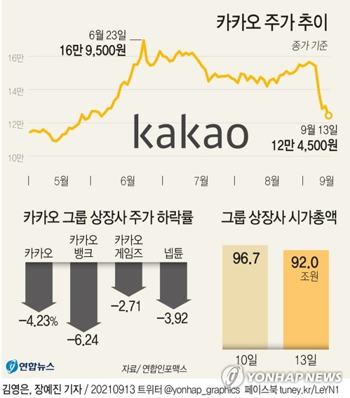 그룹 상장사 시총은 카카오뱅크가 상장한 지난 8월 6일(104조7천196억원) 이후 줄곧 100조원 이상을 유지했으나 최근 잇단 하락세에 지난 9일 종가 기준 97조4천24억원을 기록해 한 달여만에 100조원선이 무너졌다.