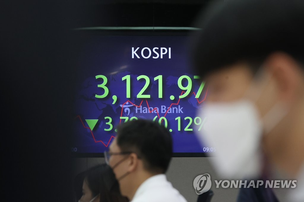 ▲ 코스피 하락세 출발 (서울=연합뉴스) 임화영 기자 = 코스피가 하락세로 출발한 13일 오전 서울 중구 하나은행 딜링룸 모니터에 코스피 지수가` 표시돼있다. 코스피는 전장보다 8.41포인트(0.27%) 낮은 3,117.35, 코스닥지수는 1.05포인트(1.10%) 내린 1,036.86에 출발했다. 2021.9.13 hwayoung7@yna.co.kr