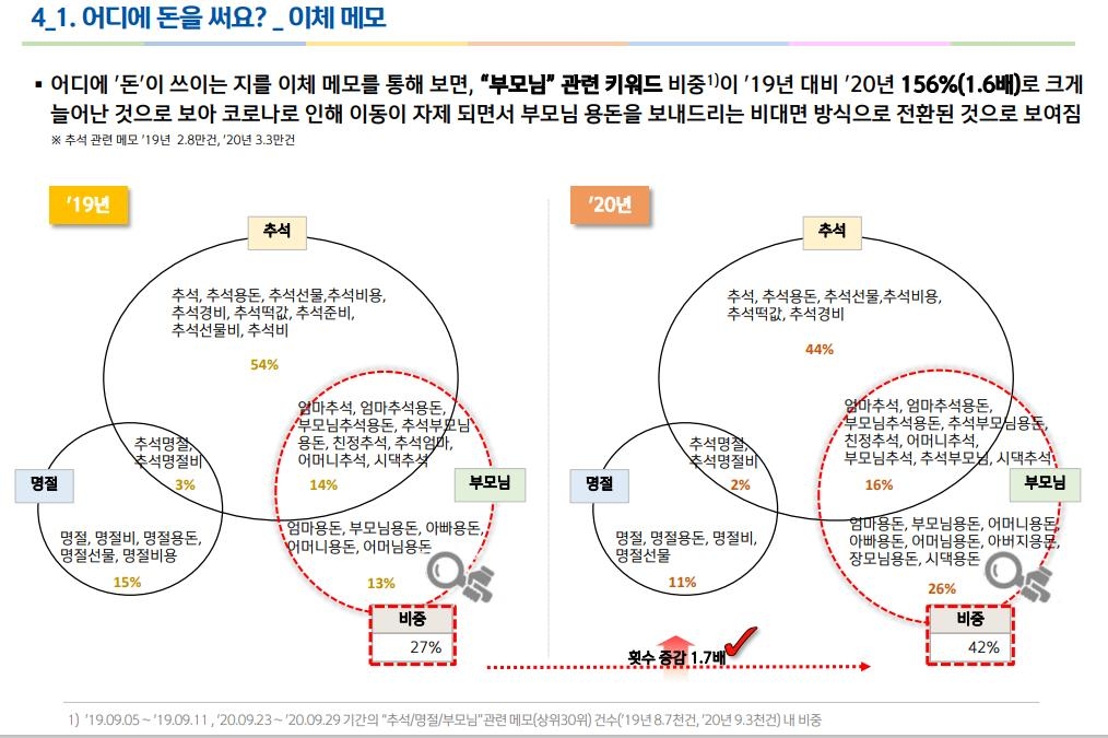신한은행이 13일 발간한 '추석판 눈치코치 금융생활' 보고서에 따르면 2019년과 2020년 추석 전후 1주일 이체 메모를 분석한 결과, '부모님' 관련 메모의 비중이 1년새 27%에서 1.6배인 42%로 커졌다.