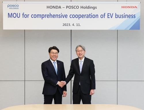 SEOUL, April 12 (Yonhap) -- POSCO Holdings Inc., South Korea's top steelmaker, said Wednesday it has signed a memorandum of understanding with Japanese carmaker Honda Motor Co. to cooperate in the electric vehicle (EV) battery materials business.