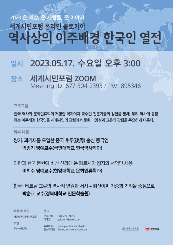 (서울=연합뉴스) 성도현 기자 = 사단법인 세계시민포럼은 '제16회 세계인의 날'(5월20일)을 맞아 오는 17일 온라인 화상회의 플랫폼 줌을 통해 기념 강연을 연다고 16일 밝혔다.