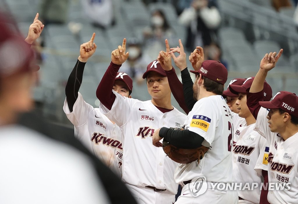 | ▲ Members of the Kiwoom Heroes celebrate their 8-3 victory over the Samsung Lions in a Korea Baseball Organization regular season game at Gocheok Sky Dome in Seoul on Oct. 27, 2021. (Yonhap) |