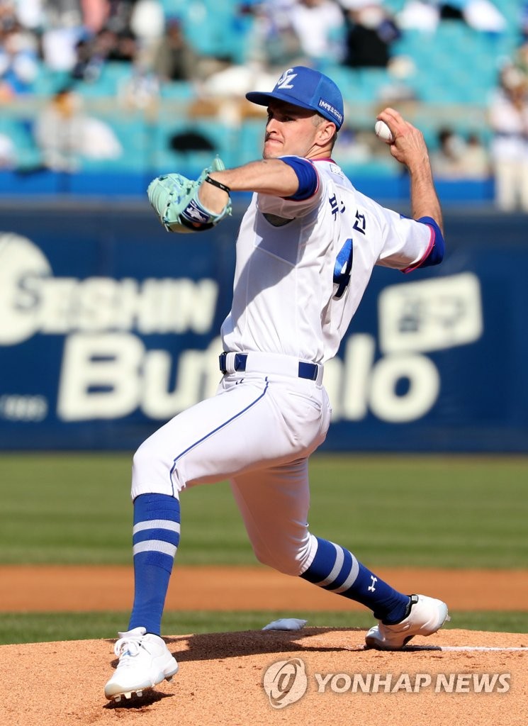 | ▲ Samsung Lions' starter David Buchanan pitches against the SSG Landers in the top of the first inning of a Korea Baseball Organization regular season game at Daegu Samsung Lions Park in Daegu, about 300 kilometers southeast of Seoul. (Yonhap) |