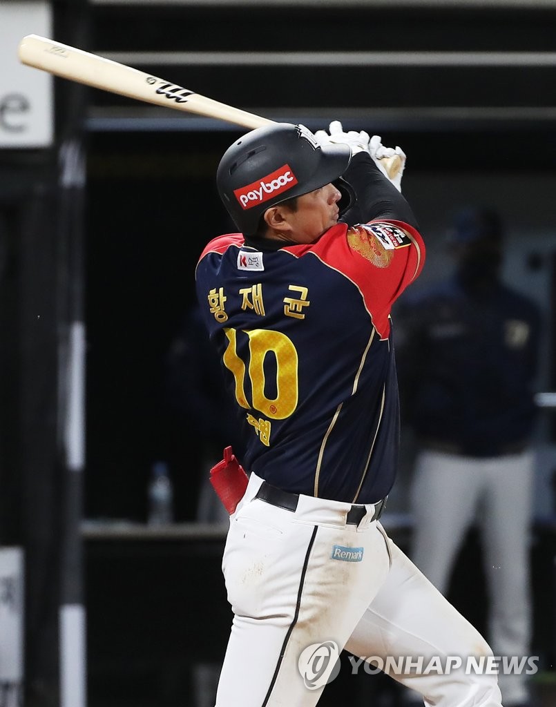 | ▲ Hwang Jae-gyun of the KT Wiz hits an RBI single against the NC Dinos in the bottom of the fourth inning of a Korea Baseball Organization regular season game at KT Wiz Park in Suwon, about 45 kilometers south of Seoul, on Oct. 27, 2021. (Yonhap) |
