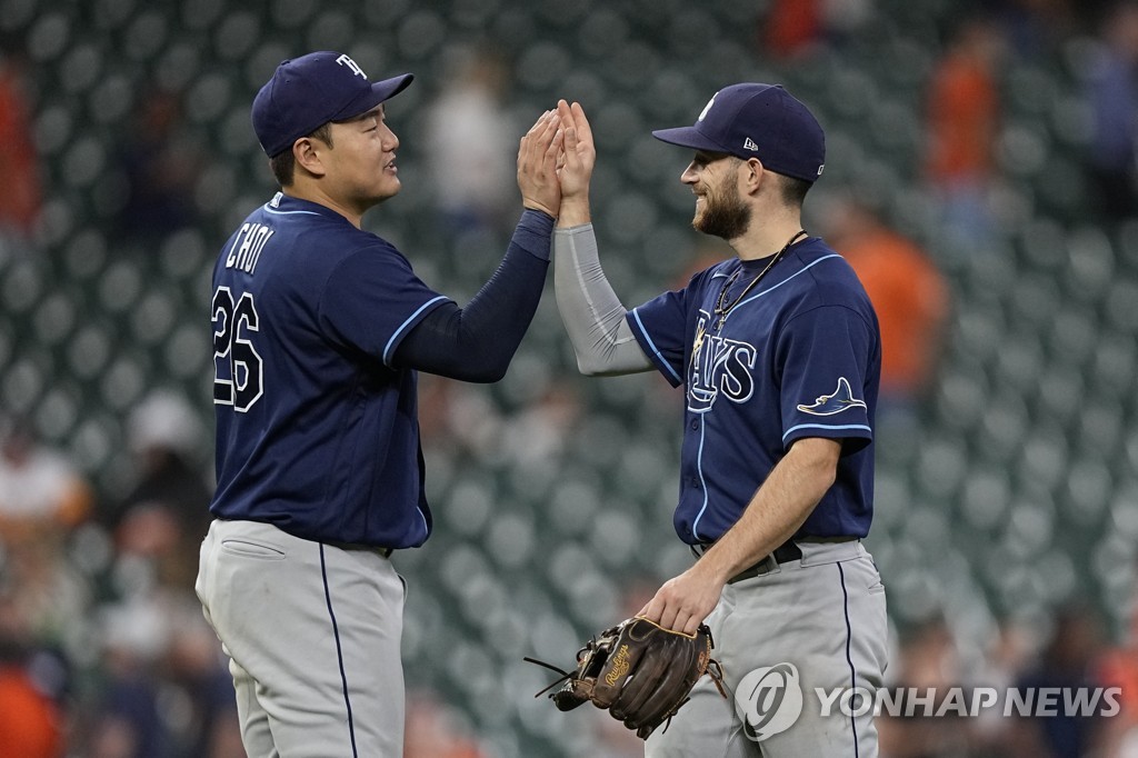 | ▲  In this Associated Press file photo from Sept. 29, 2021, Choi Ji-man (L) and Brandon Lowe of the Tampa Bay Rays celebrate their 7-0 victory over the Houston Astros in a Major League Baseball regular season game at Minute Maid Park in Houston. (Yonhap) |