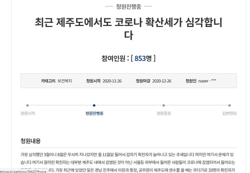 제주도민으로 보이는 또 다른 청원자는 '최근 제주도에서도 코로나 확산세가 심각합니다'라는 게시글을 통해 '사회적 거리두기 단계를 격상하고, 단순 여행목적의 방문을 통제해야 한다'는 주장을 했다.