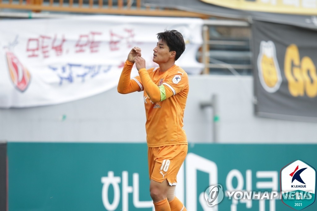 | ▲ Joo Min-kyu of Jeju United celebrates his goal against Suwon FC during the clubs' K League 1 match at Jeju World Cup Stadium in Seogwipo, Jeju Island, on Nov. 6, 2021, in this photo provided by the Korea Professional Football League. (PHOTO NOT FOR SALE) (Yonhap) |