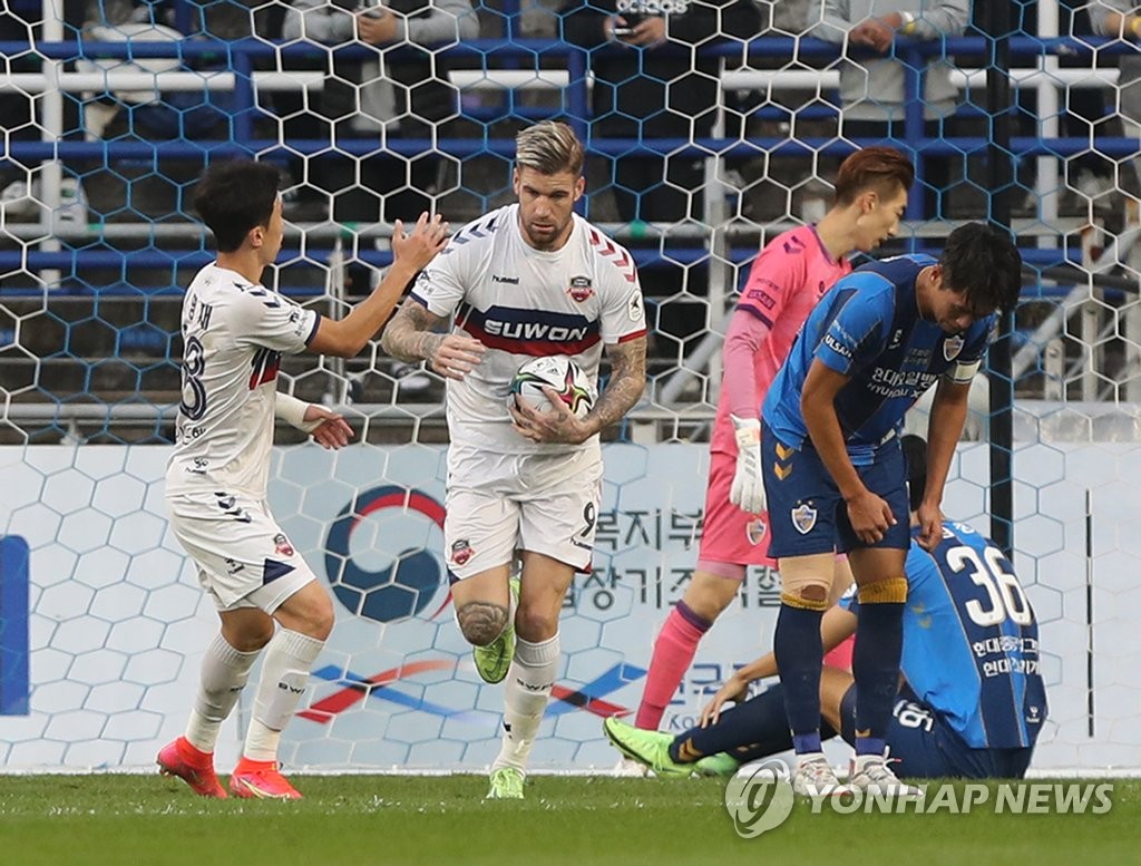 | ▲ In this file photo from Oct. 31, 2021, Lars Veldwijk of Suwon FC (C) runs back with the ball after scoring against Ulsan Hyundai FC during the clubs' K League 1 match at Munsu Football Stadium in Ulsan, some 415 kilometers southeast of Seoul. (Yonhap) |