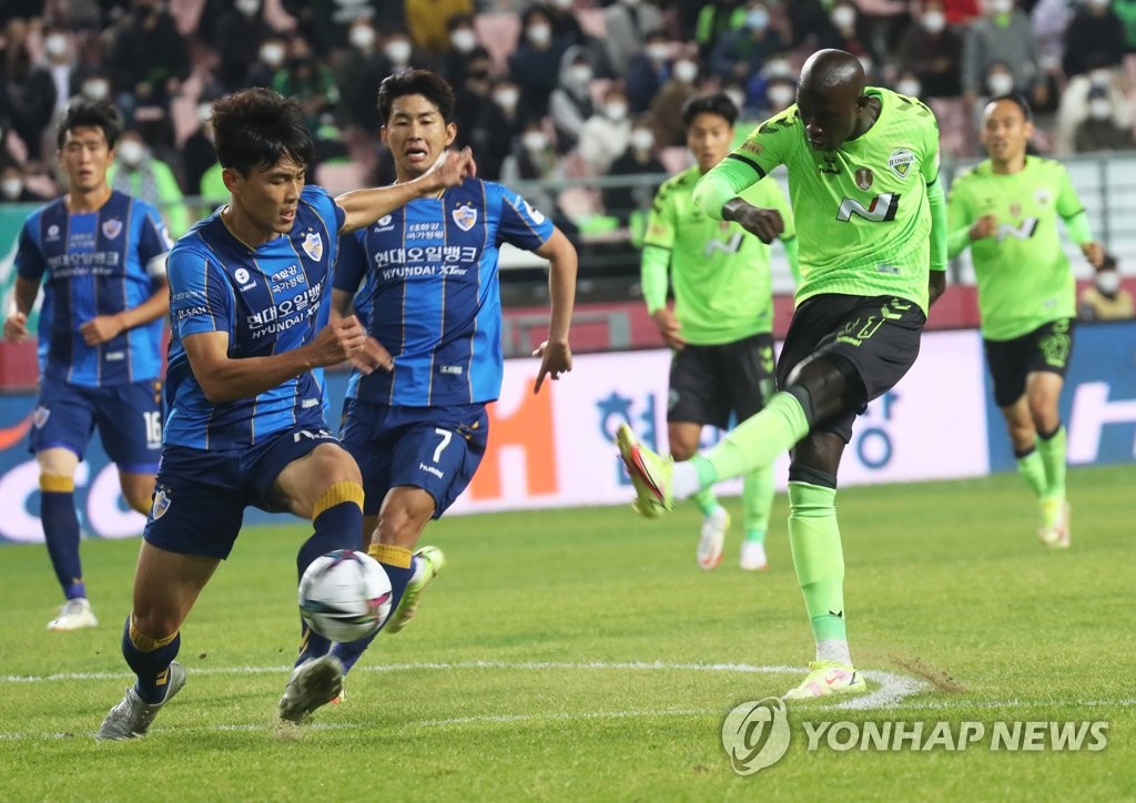 | ▲ In this file photo from Nov. 6, 2021, Mo Barrow of Jeonbuk Hyundai Motors (R) takes a shot against Ulsan Hyundai FC during the clubs' K League 1 match at Jeonju World Cup Stadium in Jeonju, some 240 kilometers south of Seoul. (Yonhap) |
