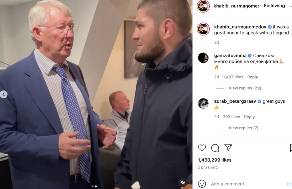 경기 뒤 누르마고메도프는 퍼거슨 전 감독과 대화를 나누는 장면을 영상으로 찍어 인스타그램에 올렸다.