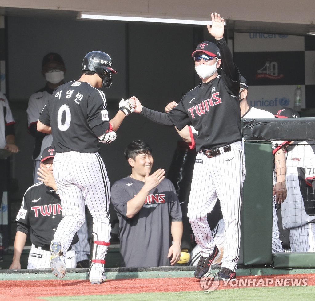 | ▲ LG Twins manager Ryu Ji-hyun (R) bumps fists with Lee Young-bin following Lee's two-run home run against the Lotte Giants during the top of the seventh inning of a Korea Baseball Organization regular season game at Sajik Stadium in Busan, 325 kilometers southeast of Seoul, on Sept. 4, 2022. (Yonhap) |