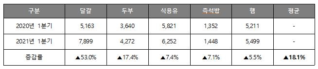 가격 상승률이 가장 높은 품목은 달걀(53.0%)이었고, 이어 두부(17.4%), 식용유(7.4%), 즉석밥(7.1%), 햄(5.5%) 등의 순이었다. 이들 5개 품목의 평균 상승률은 18.1%였다.