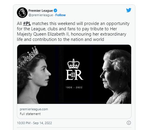 프리미어리그는 8일 여왕이 서거하자 10∼12일 열릴 예정이었던 정규리그 7라운드 경기 개최를 모두 취소한 바 있다.
