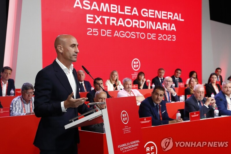 | ▲ 현지시간 25일 열린 스페인축구협회 임시총회에서 발언하는 루비알레스 회장 [AP=연합뉴스] |